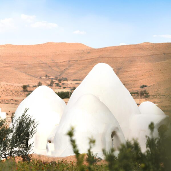 Il récolte l’eau de pluie via une « Majel », une sorte de citerne installée sur le toit-terrasse de ses écodômes qui permet de récupérer l’eau de pluie. Cette technique ancestrale revient en effet à la mode en Tunisie, face au manque d’eau. Dans le gouvernorat de Tataouine où se trouve son domaine, les agriculteurs ont souffert de la sécheresse avec presque aucune pluie pendant sept ans jusqu’en 2023. Des records de température ont été enregistrés en 2022 et 2023 avec 47 degrés en septembre, du jamais-vu depuis 1950.