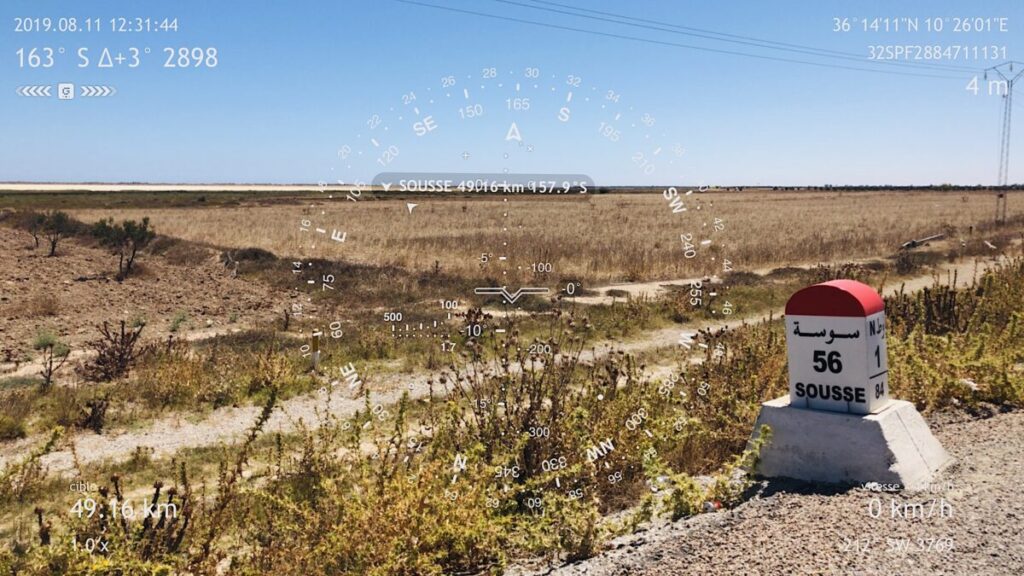 Posnetek med performansom Hor-I-zons (Korak N° 102 - Hammamet - Enfidha). Dokumentira ključni trenutek poti, 56 km od Sousse, rojstnega mesta Ridhà Dhība, katerega smer je označena z bousolo v razširjeni resničnosti © DR