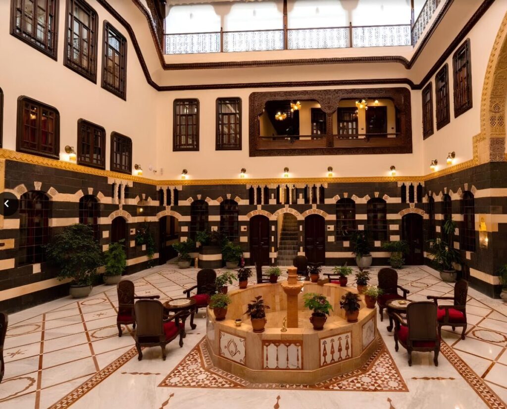 Suriye'nin geleneksel evleri, evin merkezi olan iç avlu etrafında düzenlenmiş bir düzene sahiptir. Bu gökyüzüne açık yaşam alanı genellikle Jasminum sambac (Damasoğlanı), Rosa × damascena (Damas gülü) ve Citrus aurantium (Portakal ağacı) gibi bitkilerle süslenmiştir. Ayrıca çeşmeler ve mozaikler de bulunmaktadır. Bu aile buluşma yeri içinde değerli bir kombinasyon olan ışık ve serinliğin keyfini çıkarırlar.